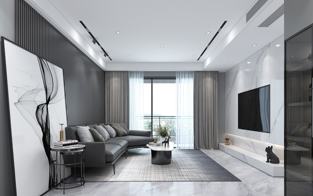 黑色皮质沙发与背景格栅板相得益彰,布艺沙发、电视墙的白色纹理大理石等等颜色和材质的结合凸显了整个空间的***和质感。