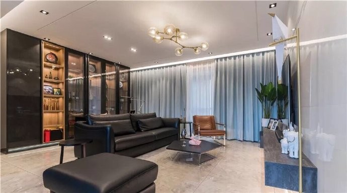走过玄关就到了客厅和书房二合一的空间,两个空间打通起来,显得格外的宽敞,书房的书柜也作为展示柜来使用,搭配藏光更显豪华。