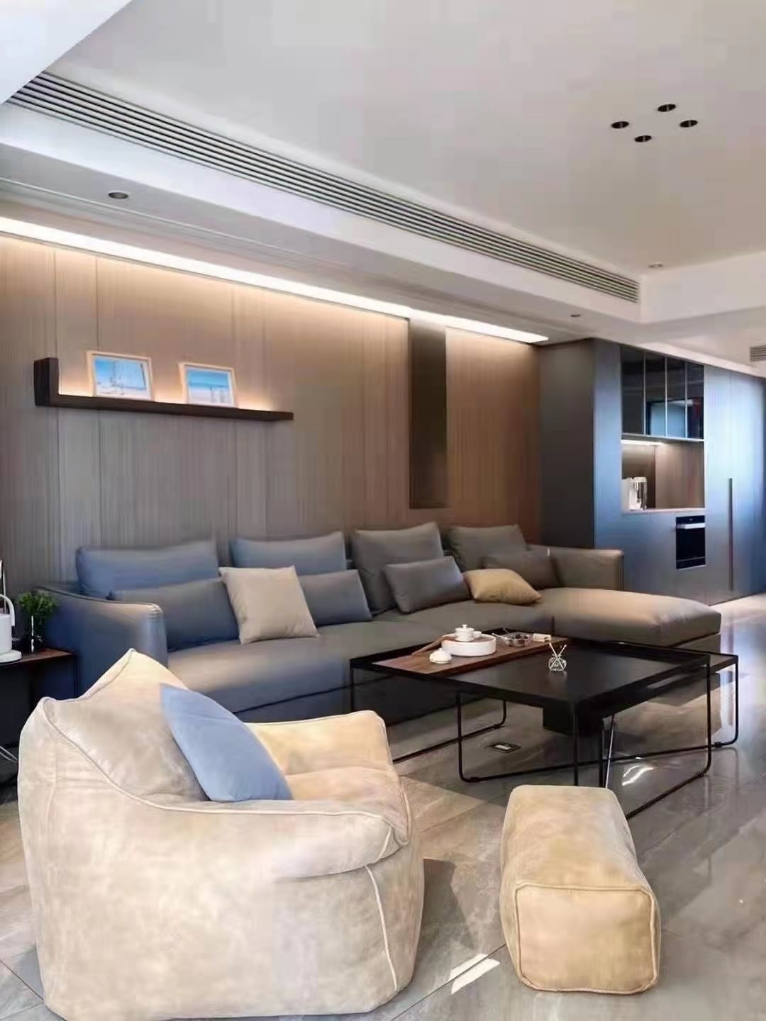 沙发背景墙的硬包拉伸了整体档次。
