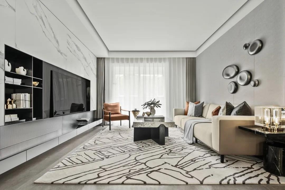 冷色调的客厅,现代感十足。地毯选择了较大尺寸,将沙发、茶几及周围区域,都容纳进来,这样看着舒适性更强,同时也可以增添客厅丰富性。