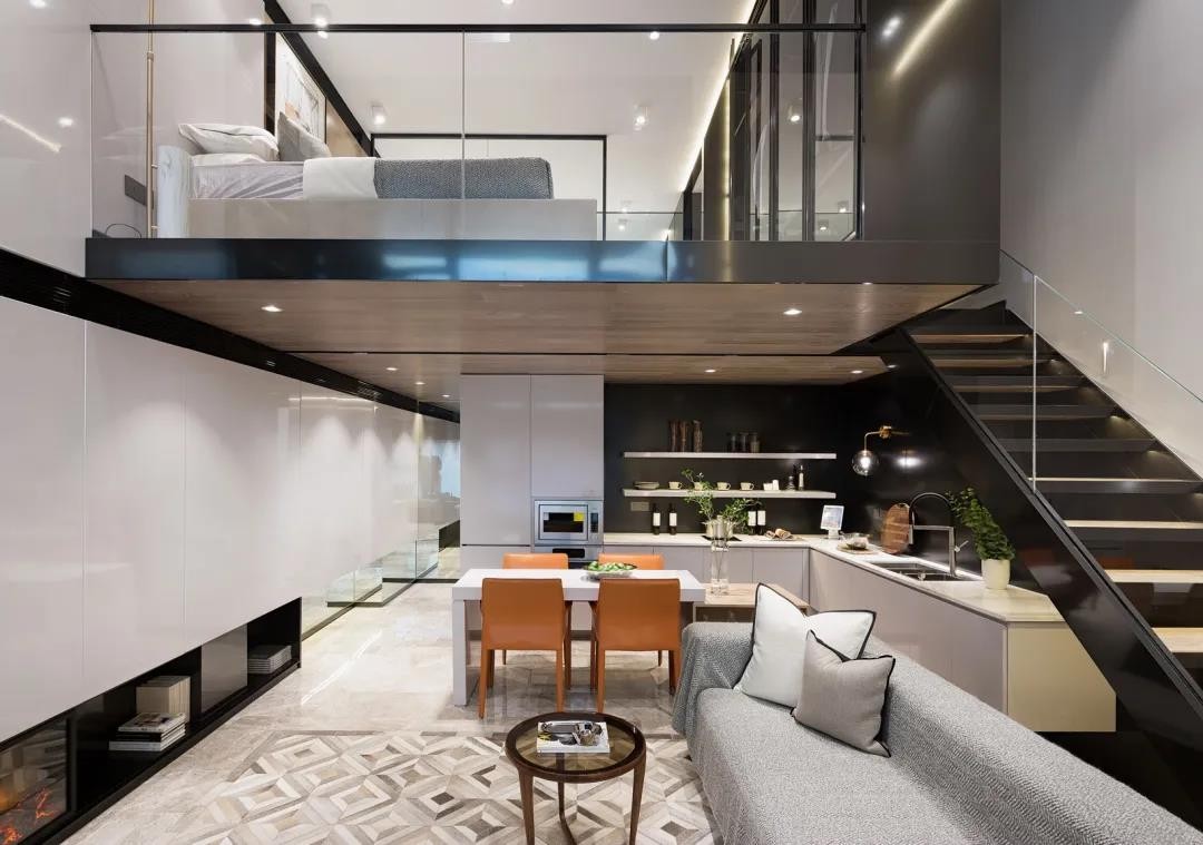 餐厅上方是小公寓的卧室区域,通过沙发后方的楼梯就可以进入到卧室区域。