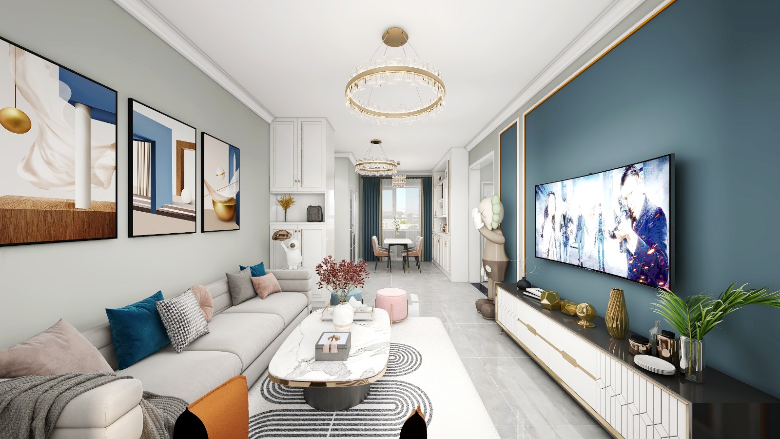 古蓝色是客厅的主题色,灯具、软装选择轻奢风金色调。