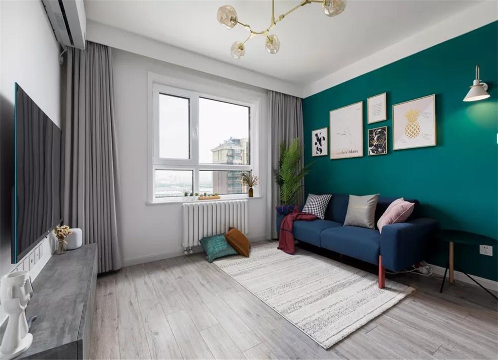 这是一套建筑面积70平米的现代风小户型二居室案例,房子整体偏向于简约,设计师通过墨绿色和深蓝色的背景墙,来提升整个空间的稳重感,让这个小窝变得更有格调和更加时尚大气!以寻求舒适、清新、古典的氛围,也算是现代欧式相比较前者又进一步了。采用三段式色彩,以深色天然岩板材为基座,中段以色调小规格较高档外墙筑砖贴面,上段为浅色调,大量运用现代简约装饰。采用几何线条装饰,颜色简洁明快,外观简洁流畅,多以波浪或
