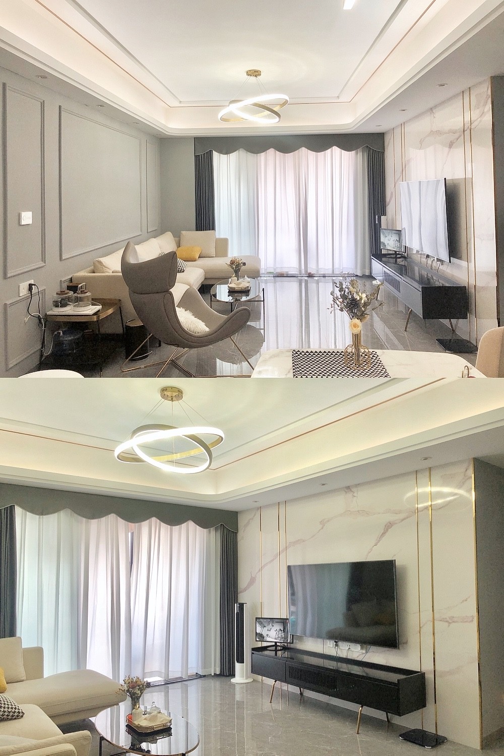 全屋风格为北欧和现代混搭,打造了小轻奢的感觉。客厅电视背景墙用的是雅士大理白加金饰条装饰。沙发背景刷漆+石膏线。