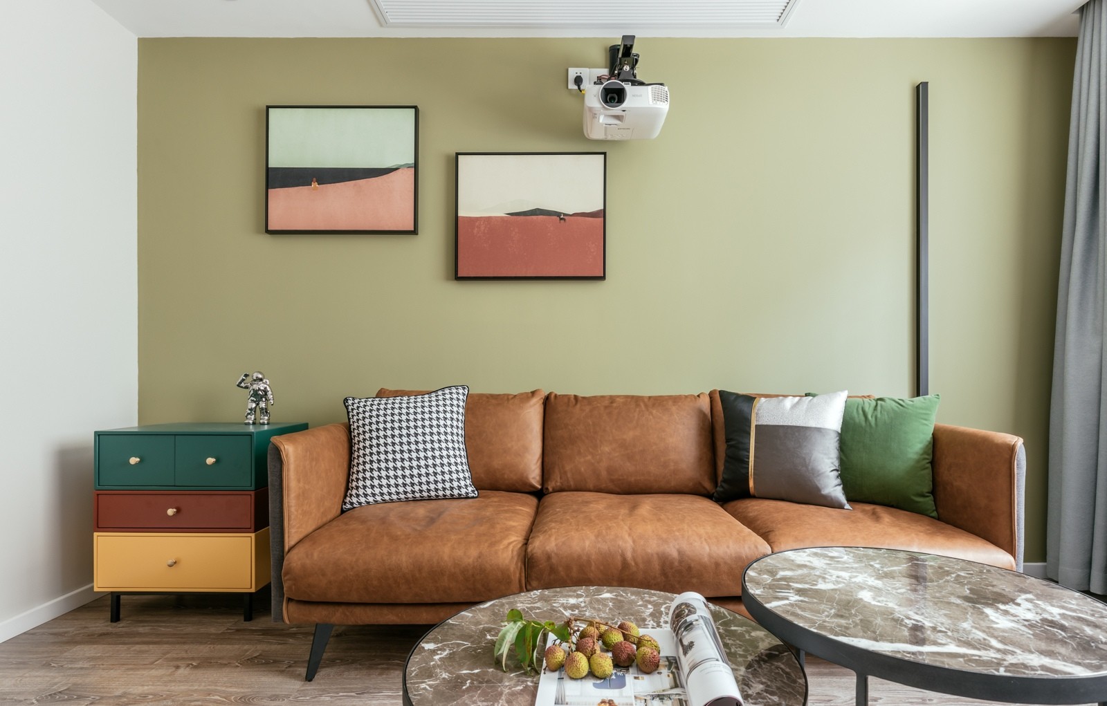 客厅***的特点就是复古色调的使用,低饱和度复古色块分散地融入空间内,华丽,又不显聒噪,活泼,又不失矜持,迎合了夫妻俩对空间风格的喜好,温暖有活力、身居其中人能够感受到独特的魅力。用投影仪和幕布代替电视背景墙,拉上窗帘便可以来一场津津有味的观影,这里是夫妻俩最满意的地方,满足了足不出户看电影的需求。