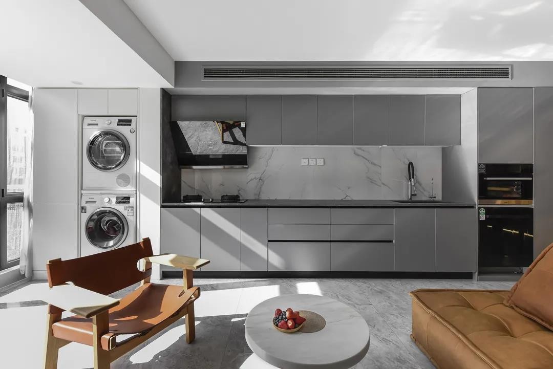 客厅阳台、开放式厨房、通往卧室的隐形门、冰箱四周柜体,这一长条都使用了柔和的灰色烤漆板。
