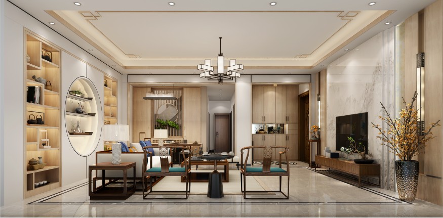 中式的美,是超越了一切的物质而到达的一种精神境界的追求,它宁谧自然,清幽静美,像一股清泉般静静地流淌在空间里。室内设计采用现代新中式风格,设计手法简洁干练。设计师在空间中细致拿捏着静谧与活跃,朴素与奢华当代与传统的关系。