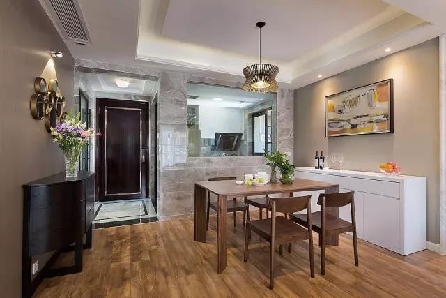 玻璃隔断,增强了餐厅与厨房的互动感的同时,也满足了餐厅的采光,大理石纹路加以木质餐桌的陪衬下大气婉约。