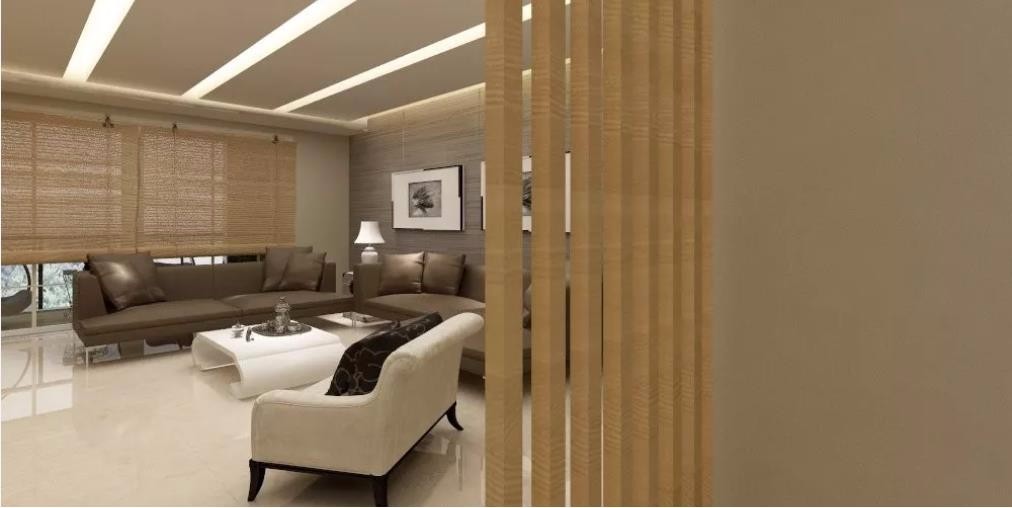 现代风格加入原木元素,整个设计以简洁大方为主,主要在于颜色的搭配,这样的设计更适合大户型,大气高雅。棚顶的造型更加时尚,搭配纯色地面,更为规整。
