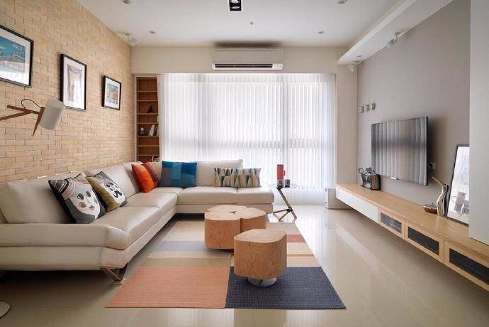 客厅摆放了一个花瓣型的木色茶几,沙发背景墙是贴了类似砖块的墙纸,地毯是彩色的的条形地毯,空间很温馨。