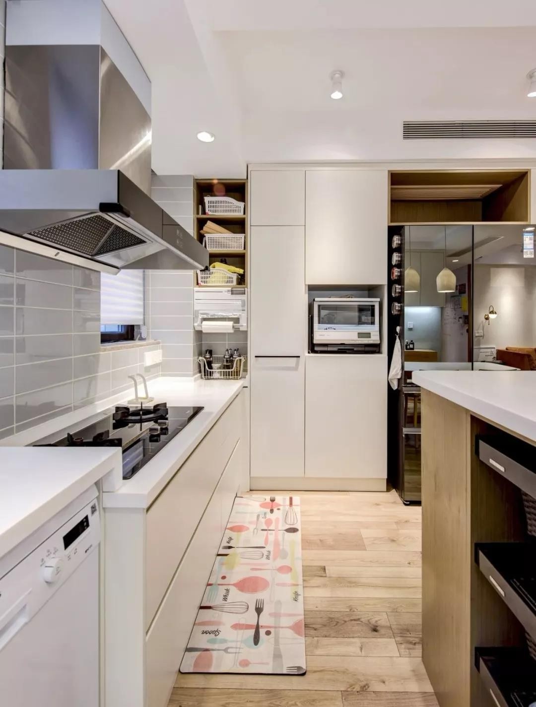 厨房依旧是以简洁大方的白色和木色为主,井然有序的橱柜收纳,让每一个角落都被充分被利用起来,让人看了真的着实佩服! (2)