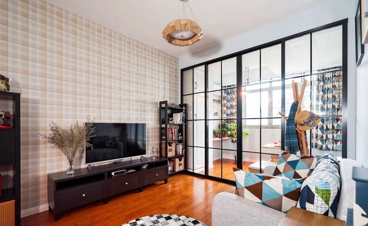 客厅里大量几何元素的运用,抱枕、地毯、窗帘、黑色隔断,壁纸和衣帽架,给人感觉非常充盈。