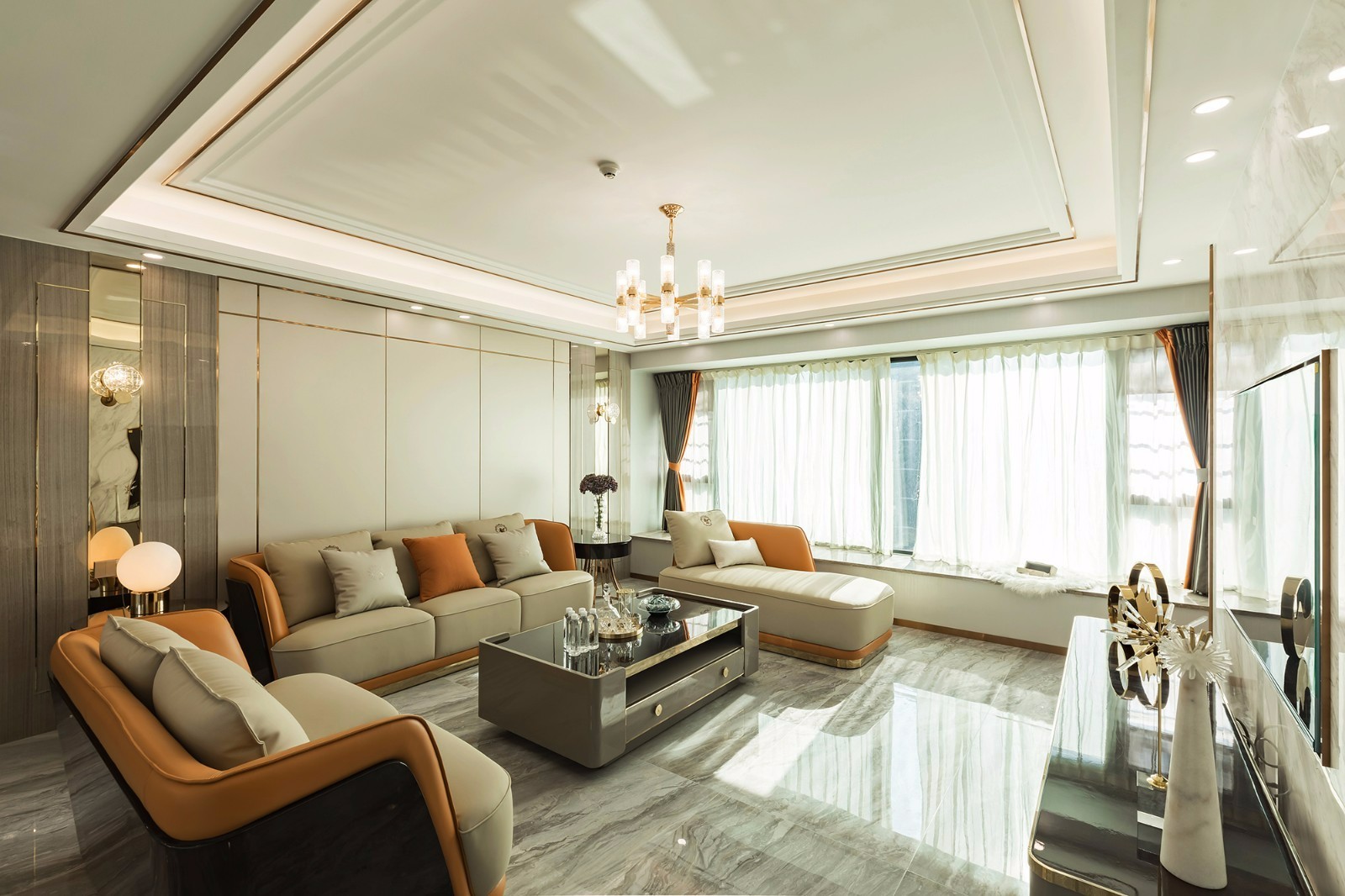 本案设计整体空间风格为现代轻奢,空间以金属、皮革的中性色调为主,用色彩的纯度传递细腻的质感。造型简洁,线条流畅的家具组合搭配,营造出稳定、协调、温馨的空间感受,满足现代年轻家庭的需求
