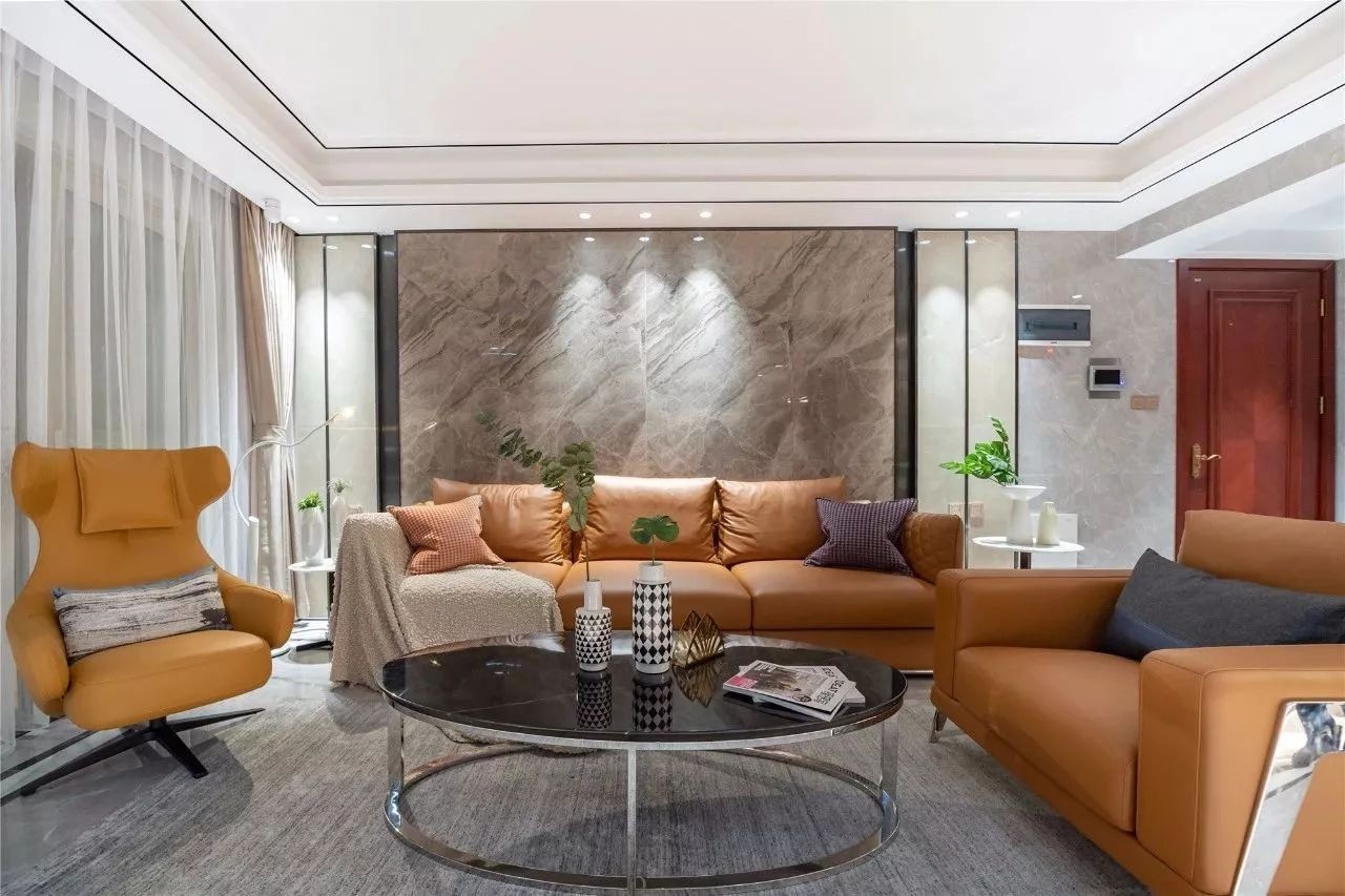 沙发墙也是大理石质感的,两侧还有边框造型,多层天花吊顶也加上了线条显得更加有层次感,搭配上橘色的皮沙发,整个空间显得端庄而又活力优雅。