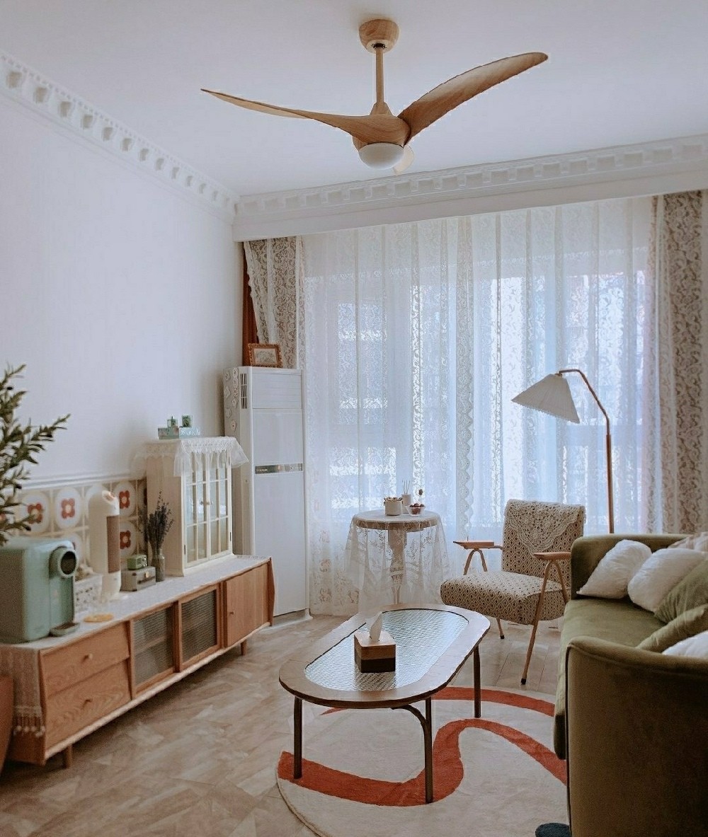 实木储物柜、木制吊扇、复古冰箱、丝绒绿色沙发搭配半墙小花砖背景墙,温馨怀旧的年代感铺面而来。这个角度看客厅90年代感气息更浓。没有电视取而代之的是实木储物小矮柜,摆上温润复古的小摆件。蕾丝窗帘、桌布、透明简约小茶几,就连墙上的摆钟都自带情怀,滴答滴答似在诉说着这个房子的故事。