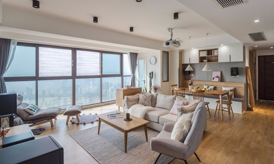客厅与餐厅背靠背是本案特点,充分的利用落地窗的采光