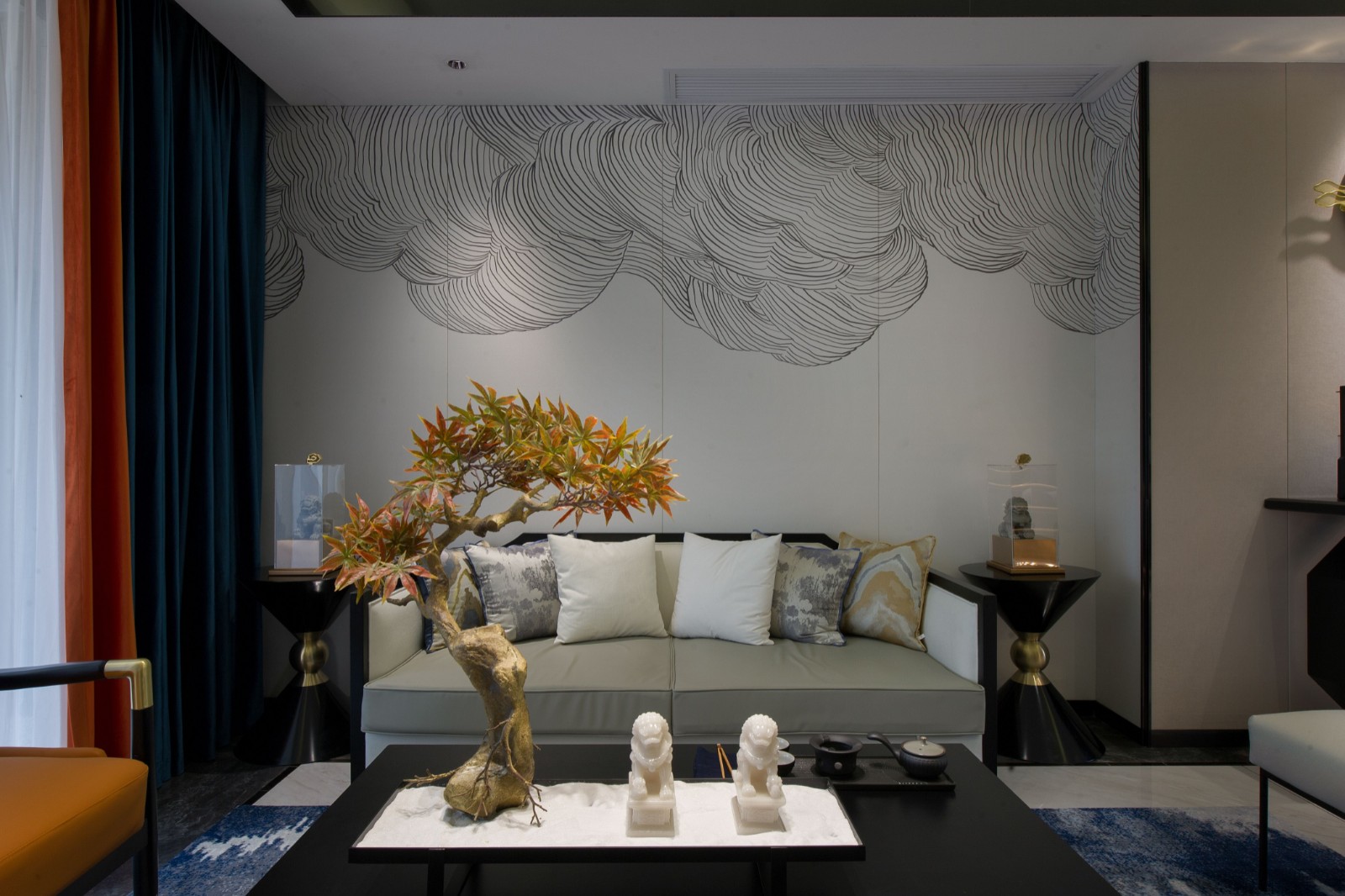 新中式的布局,讲究空间的对称以及层次感。两侧背景墙用几笔水墨勾勒出中式的意境禅意,浅色系+大面积留白,使整体空间张弛有度。