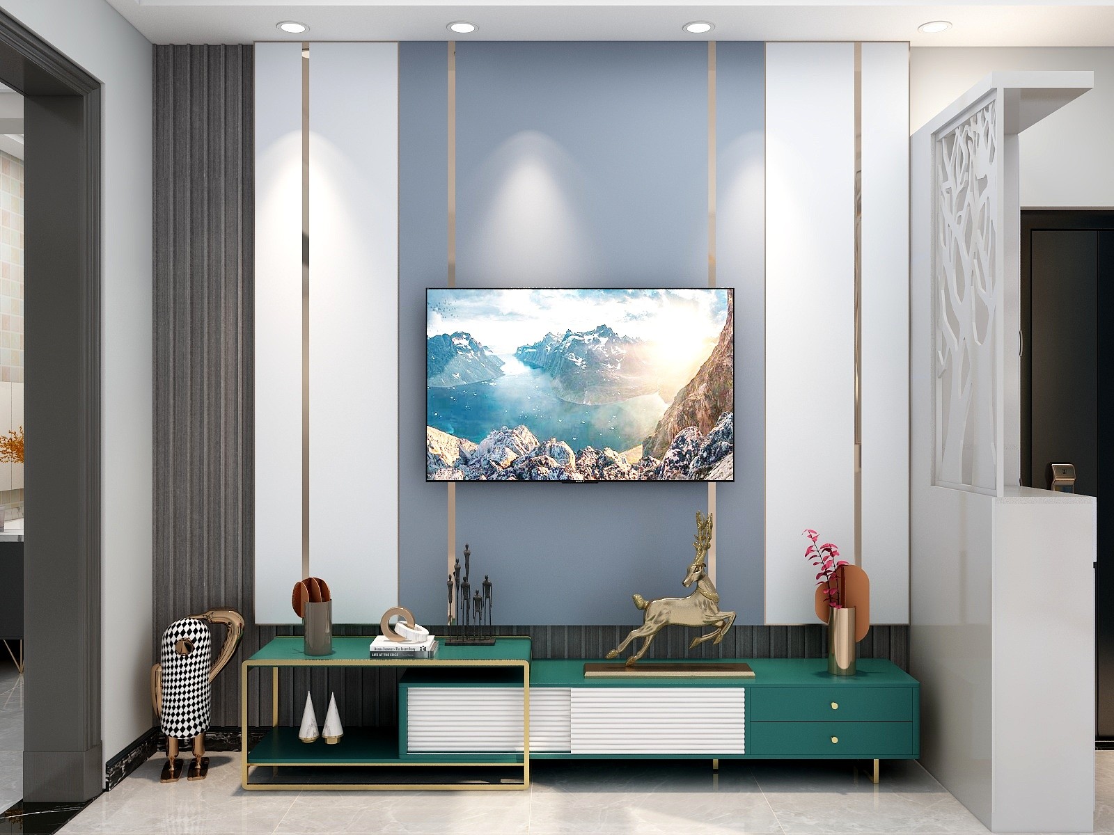 电视墙以灰色格栅搭配金属线条,配合双色漆背景,体现轻奢风格的现代、时尚与潮流感。