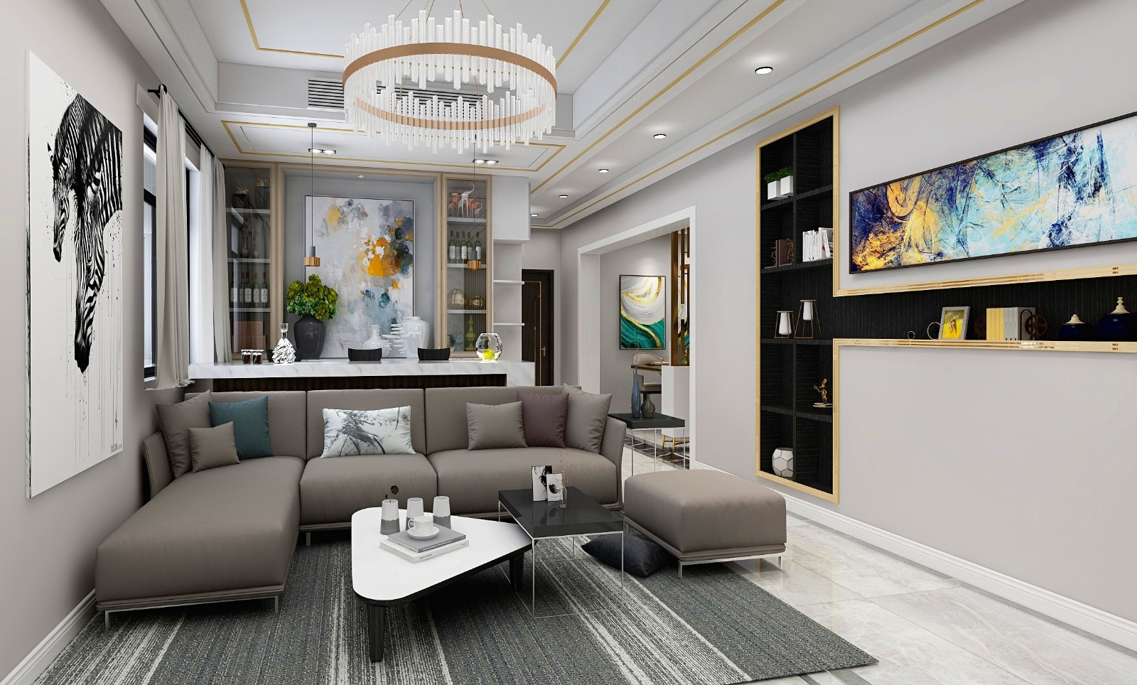 幸苦了半辈子的业主方希望通过家里的装修来体现他们现在生活的富足。浅灰咖色的墙面搭配石材电视墙。低调又显***。沙发后区的吧台区也增添了业主的生活情调。