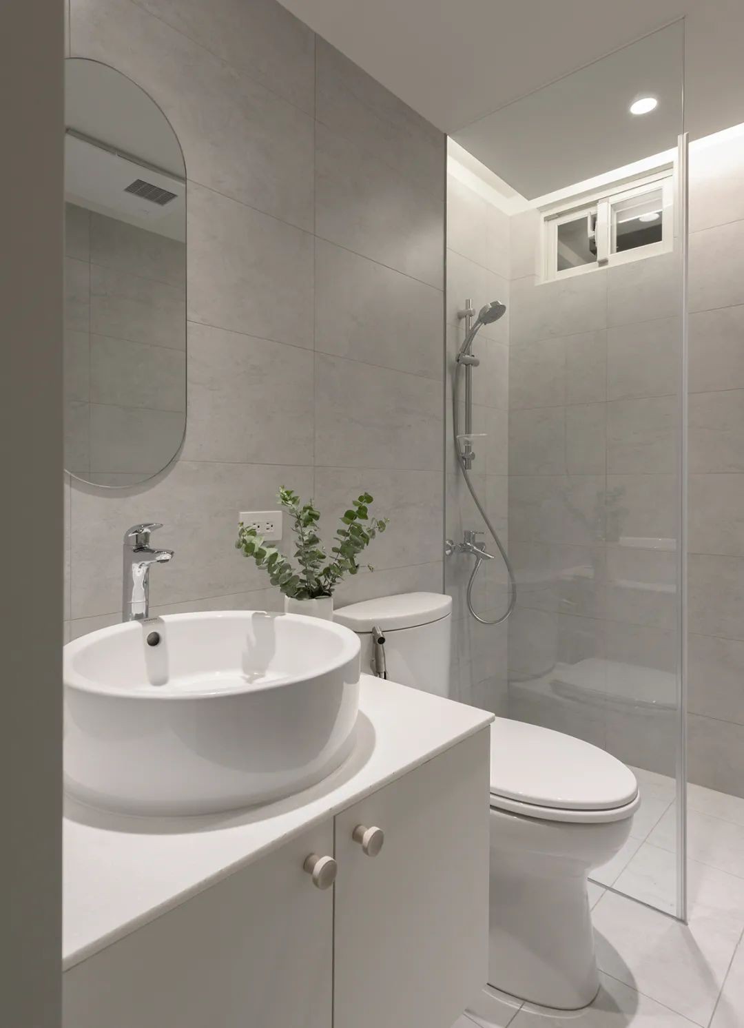 次卫简洁干净,墙面和地面选择不同尺寸的瓷砖,堆叠层次效果,同时顾及通风功能,根据工作阳台设置一道气窗,确保浴室的清爽舒适度。