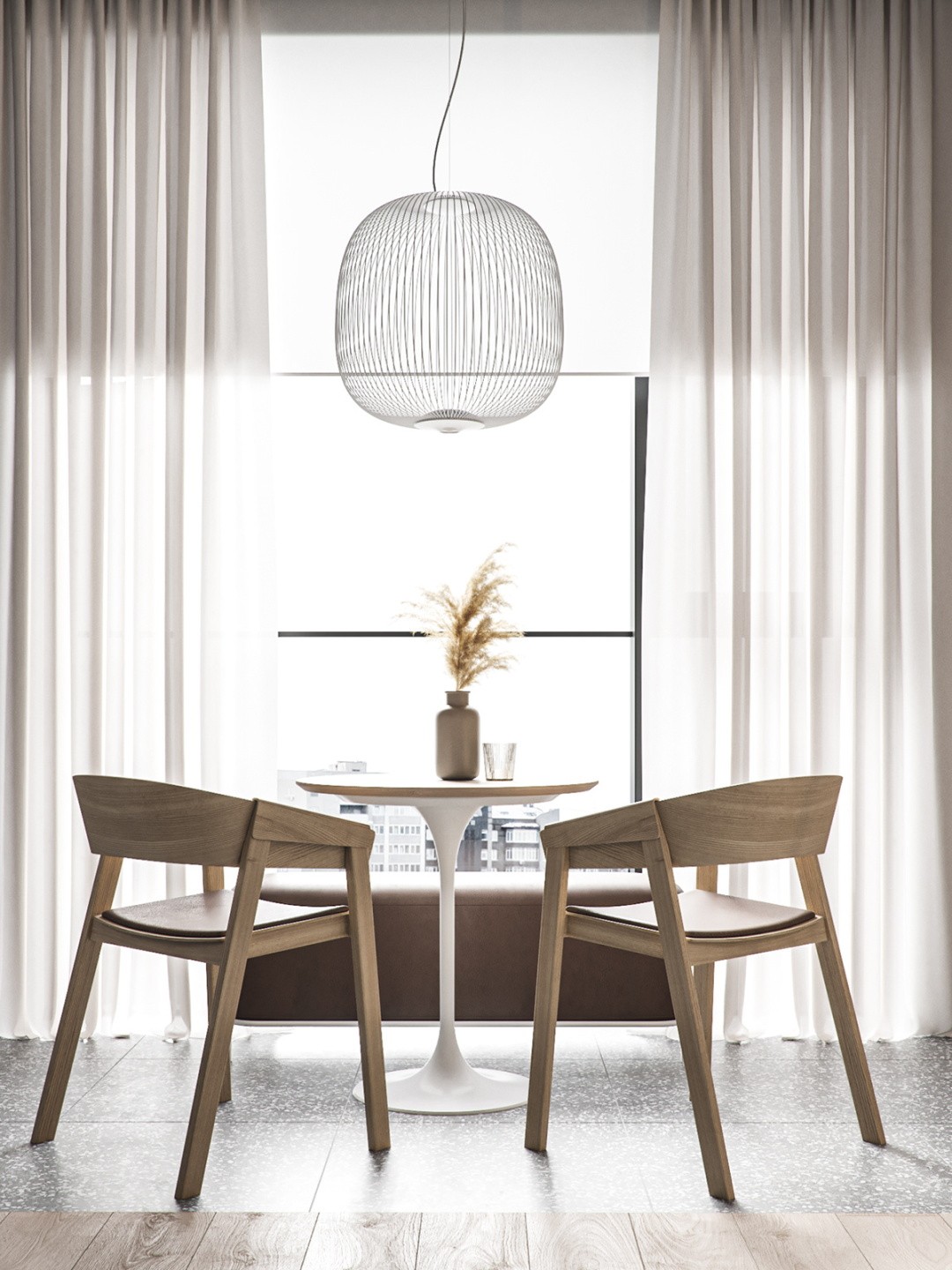 这里摆放一组木质餐椅和长凳 两把木餐椅选用舒适的棕色皮革坐垫 与窗台下的棕绒长矮凳协调一致 上方的线性小吊灯与木条纹相映成趣 看起来十分惬意