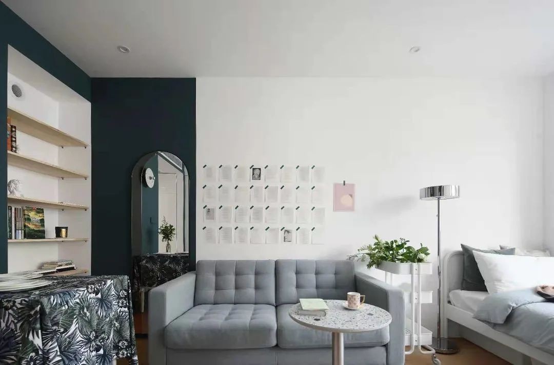 基于屋主一个人居住,大大的卧室区域如今融合了卧房、客厅、餐厅、书房功能。 因为屋主平时需要健身空间,客厅选用的都是灵活轻便的小型家具。