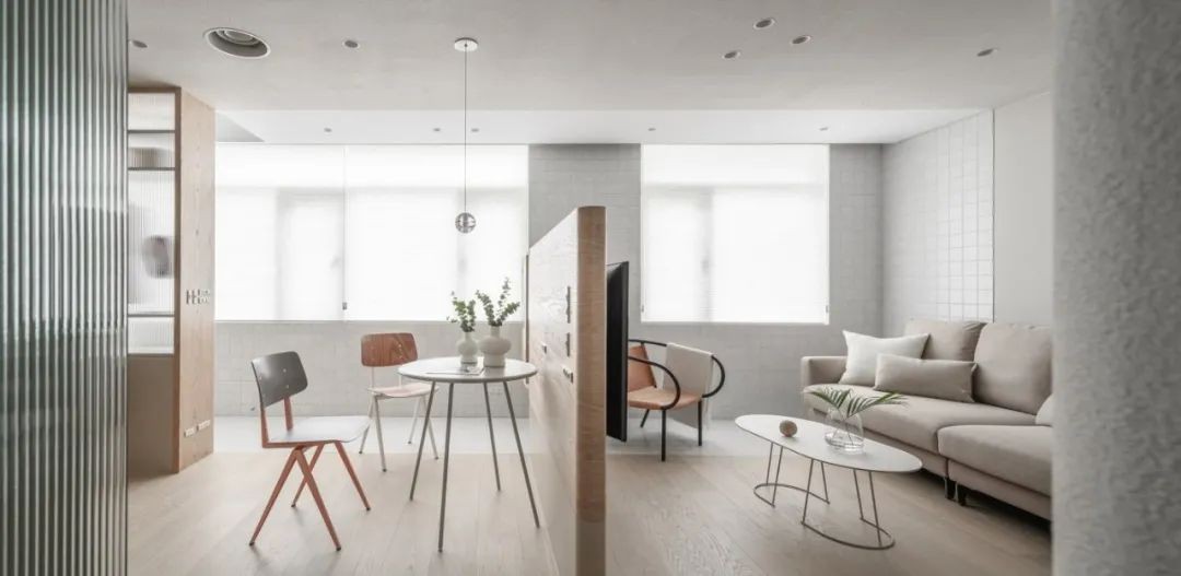 一道轻薄电视墙,划分客厅和餐厨区,既避免了开门见厅,又构成穿而不透的场域关系。 在冰箱位置竖起长虹玻璃,以轻透介质模糊份量感。