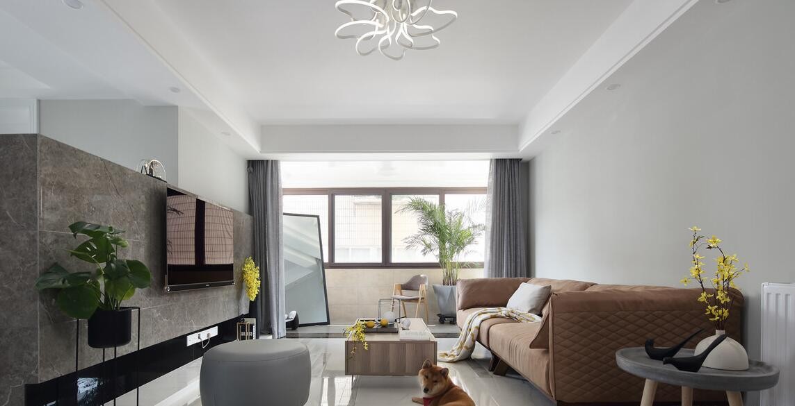 客厅电视背景墙设计采用半墙大理石铺贴处理,几何造型简单大气,整体空间布局更加通透