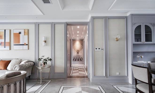 本案例汲取美式中足够温情的部分,摈弃过于厚重怀旧的形体表现。 映入眼帘的是既复古又优雅的空间,让人眼前一亮。