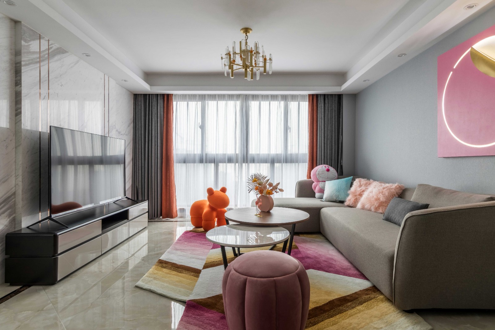 客厅是整个家的中心位置,整体的灰粉的搭配让空间显得格外恬静,搭配简约的现代家具和ins元素的软装,让恬静的空间尽显甜美。