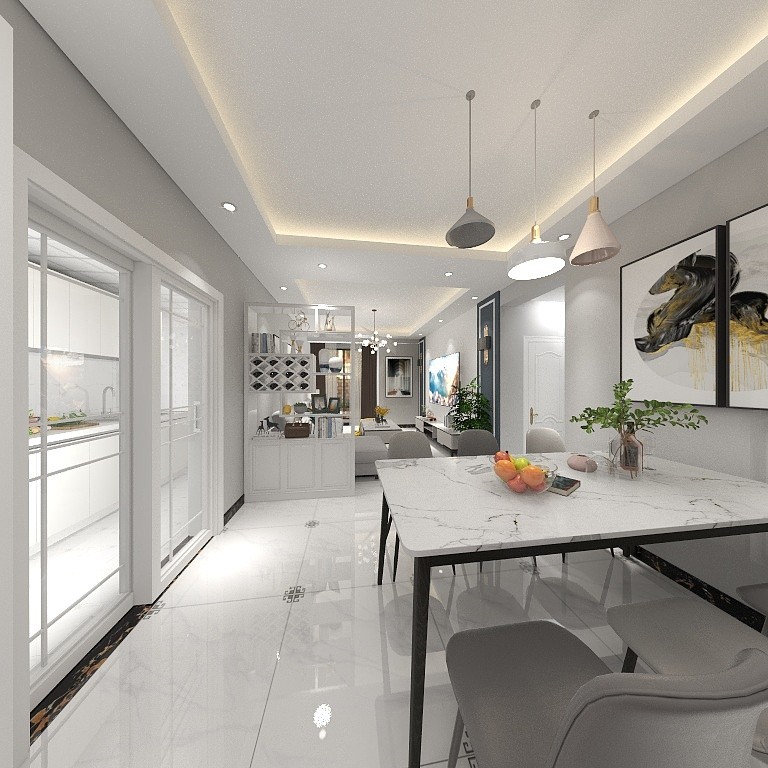 餐厅和客厅相连,面积较大,客厅外还连接有一个大面积的观景阳台,整个公共活动区域连贯宽大;观景阳台宽大实用且采光较好