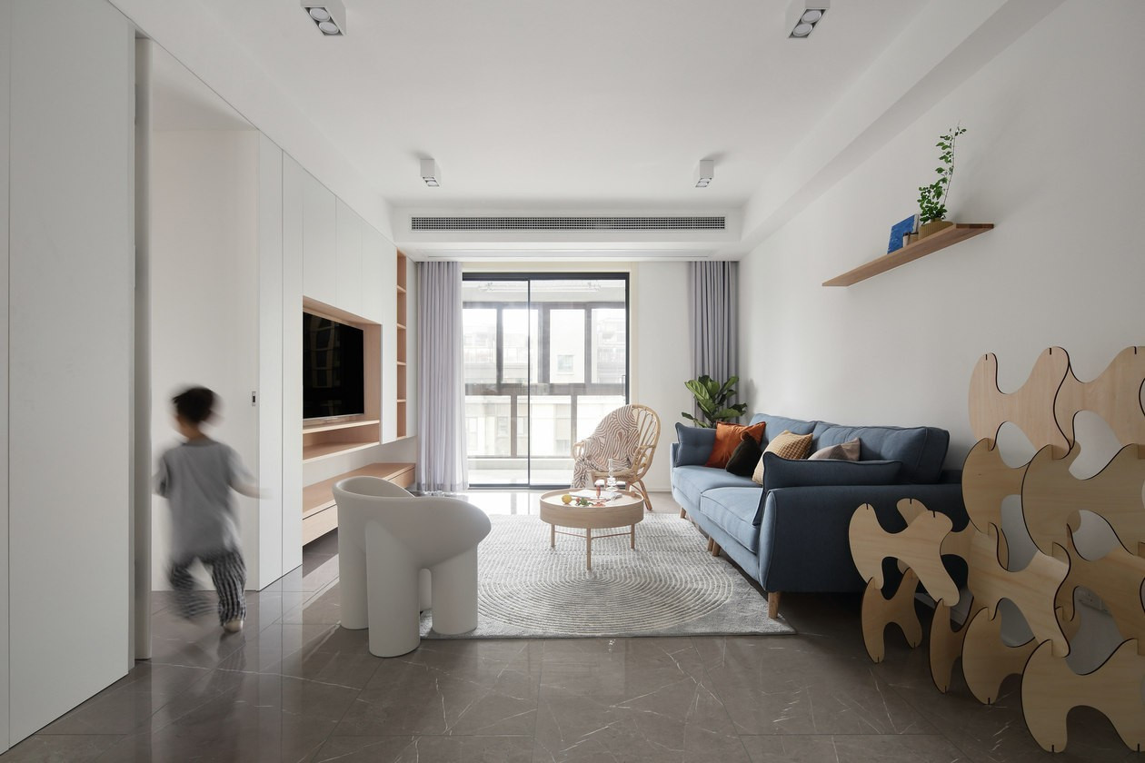 客餐厅南北贯穿 ,通透明亮,客厅运用了无主灯设计,让整个空间更显干练。留白沙发背景,延续纯净主题,局部添加了一段隔板,可以摆放一些精致的小物,表达对生活的热爱,也丰富了墙面的层次。 木色的茶几,质朴和煦。