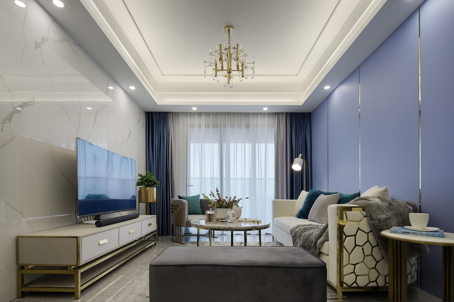 客厅天花吊顶的边框造型棱角分明,刚性美十足。浅色布艺沙发与深色抱枕的错落搭配,让空间有序自然。 也是一家人活动最集中的地方,舒适必可不少。简约大气的沙发背景墙,让空间富有层次感;茶几大理石与电视背景墙相呼应,白色中参杂的天然纹理,让空间显得格外清爽,也给人视觉上的放松。