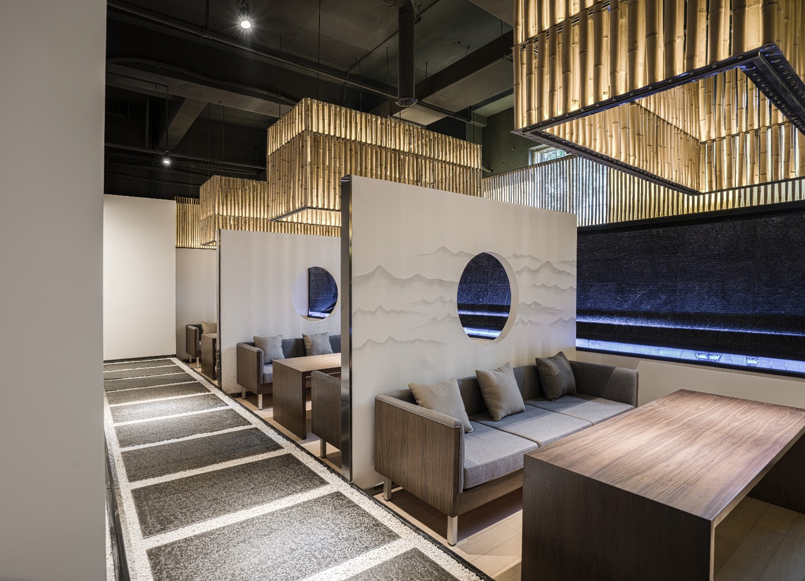 空间竹子为元素贯穿每一个区域,尤其是一区和三区之间,让空间垂直连贯,产生强大的互动,每个包间设计效果都是非常有层次,包厢空间感个个都是***的体验,人坐其中,心灵安然自得,朴素而接地气的材料,如:瓦片、细竹、青石板、枯干树、素水泥等自然材料。