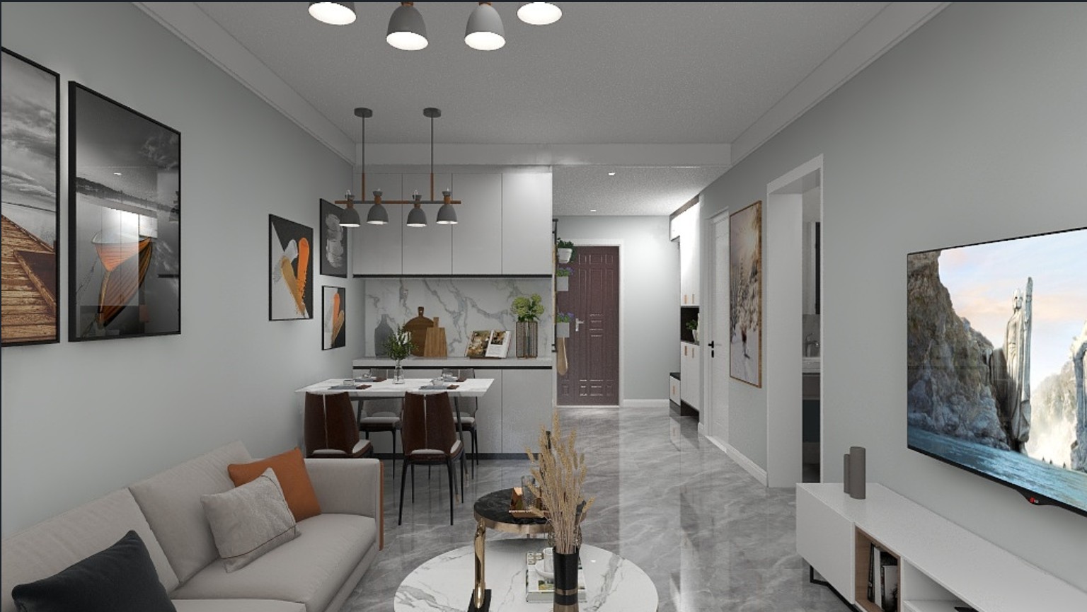 客厅顶部做双层石膏板带,无其他造型,墙漆颜色同餐厅,地面瓷砖通铺到阳台,增大整体的视觉面积,电视墙无其他造型,防止男孩儿进行破坏。