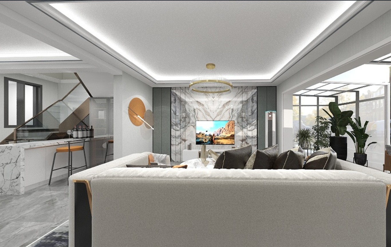 客厅顶部采用回型吊顶+反光灯槽设计,底部装不锈钢装饰线,墙面浅灰色壁纸,地面深灰色地砖,整体空间明亮,舒适,把窗户改造为阳光房后,提高采光性。