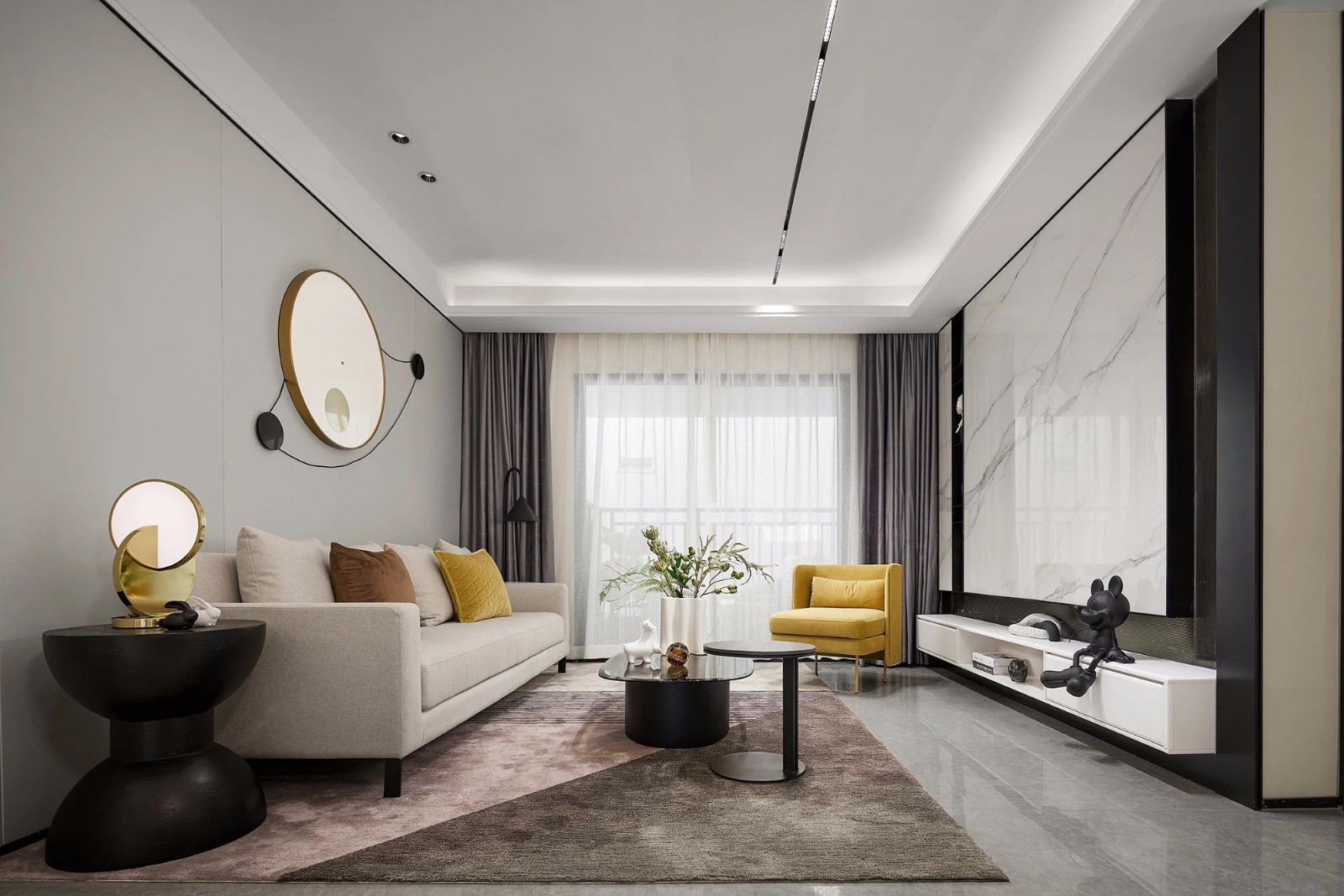 在客厅空间,浅灰质感石材和咖调家具营造现代感,一抹明媚的黄率先闯入眼帘,融入简约几何图形的软装饰品,充满童趣的玩偶形制摆件,点缀生活写意的绿植。