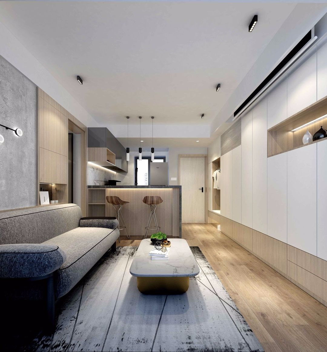 空间分两个区域,公共区域和私密区。通过暗门设计区分开。公共区主要满足会客,就餐需求。私密区主要是卫生间,书房,卧室功能。通过区域的规划,空间内部尽可能的做开敞式设计,使空间内部的视野做到***的通透。这也是小户型常用设计的手法之一。