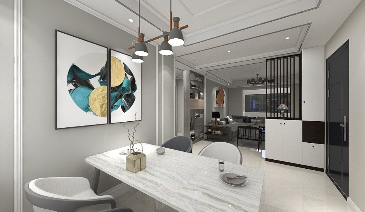 整体餐厅和入户位置,顶部做回型吊顶,安装黑色不锈钢金属装饰线,石膏造型线配差色墙漆,做餐厅背景墙,格栅式鞋柜,既保证了储物功能,又保证了客餐厅的通透性简单实用。