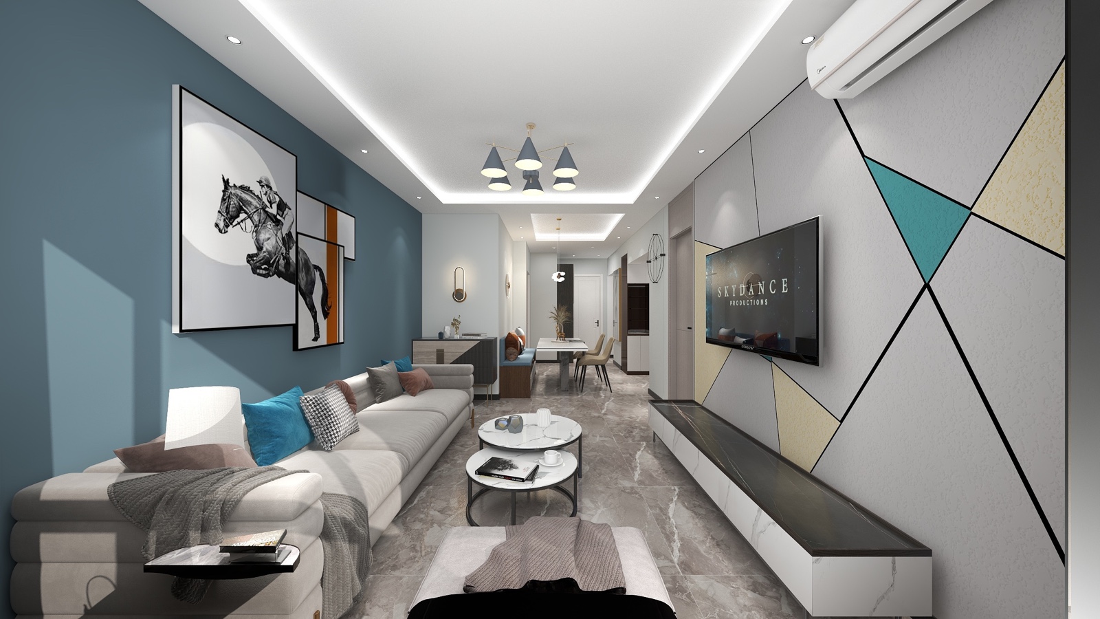 深蓝色沙发背景墙,点缀动态感十足三连幅挂画