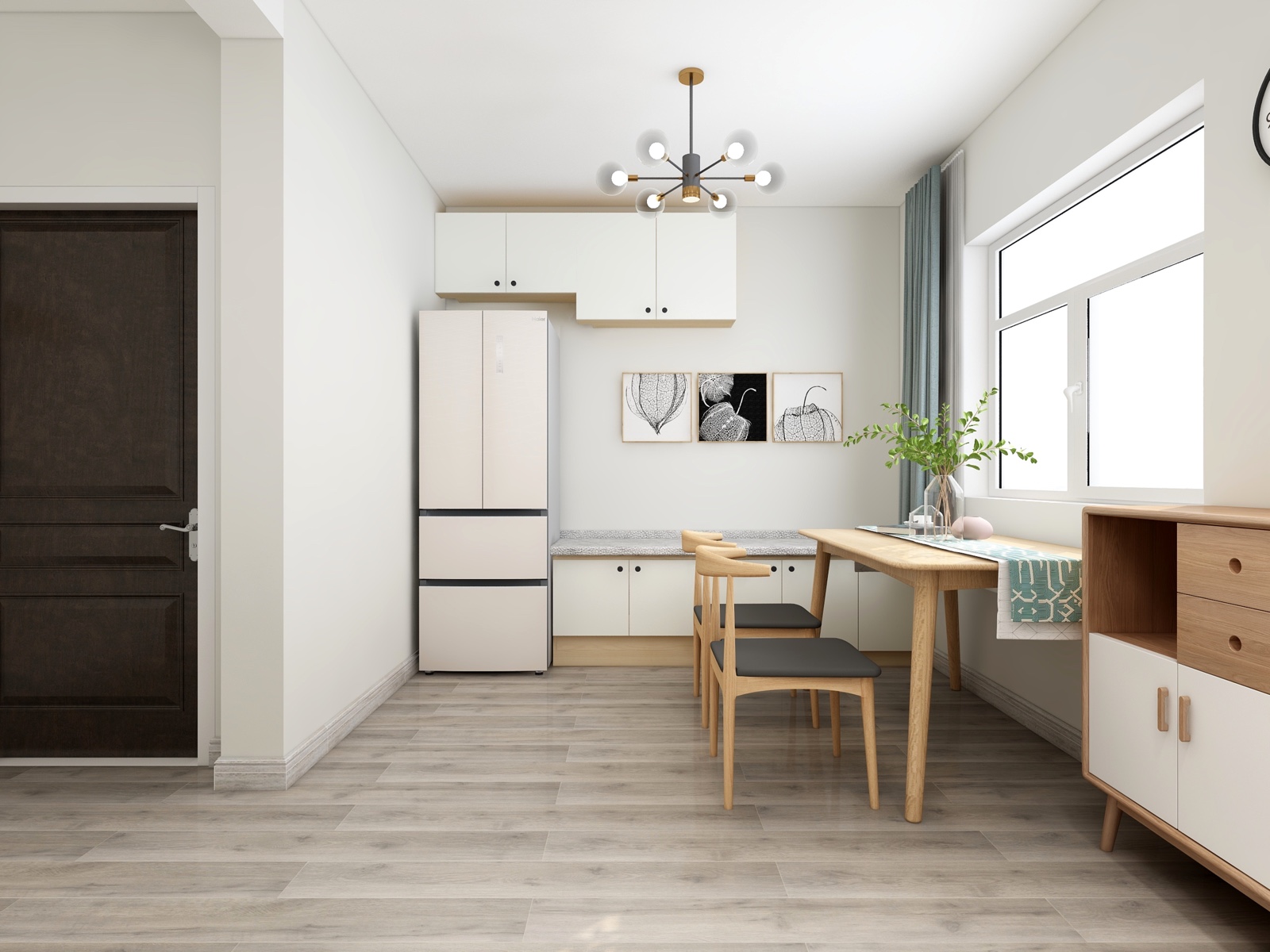 中西厨分开,l型橱柜,浅色墙漆简单吊顶