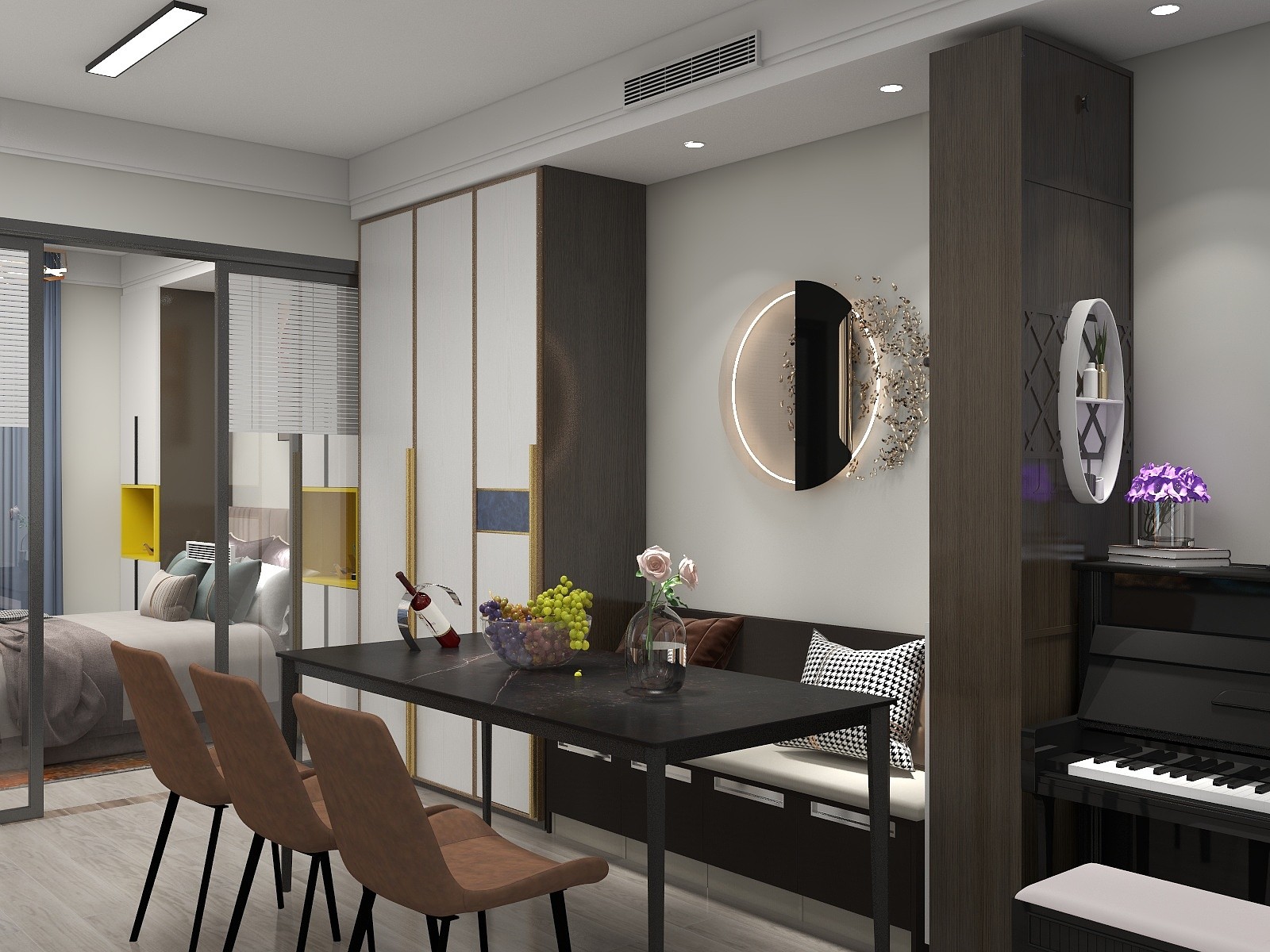 开间改两居室,自然采光较弱,电视墙较小,客厅放置钢琴,配置中央空调新风。