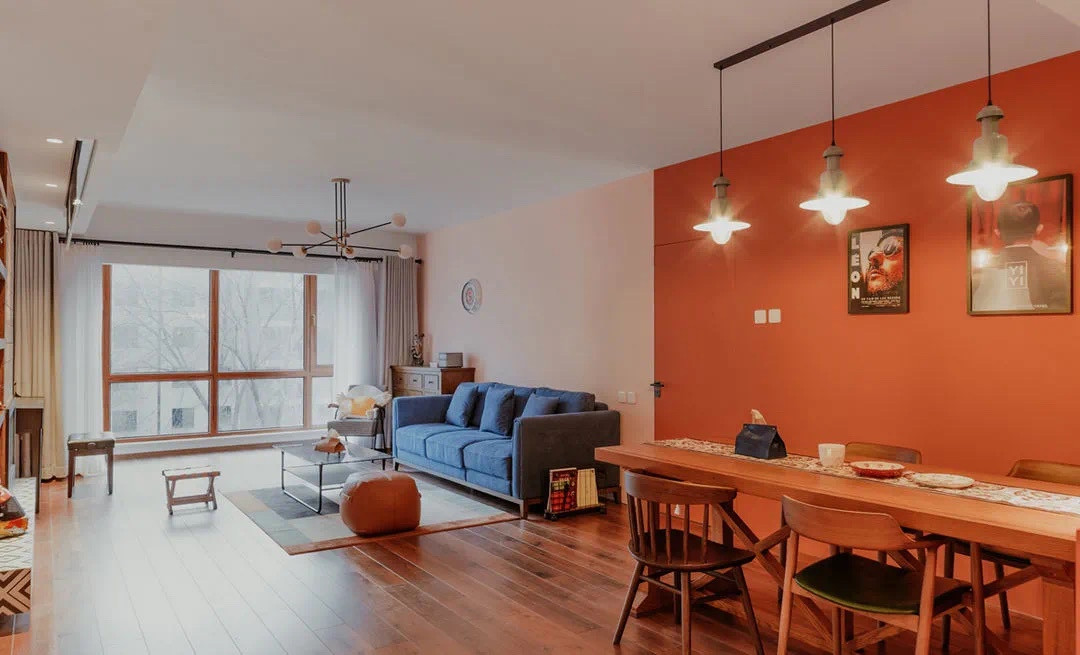 客餐厅一体,空间通透,墙面采用深浅亮色做了区分。