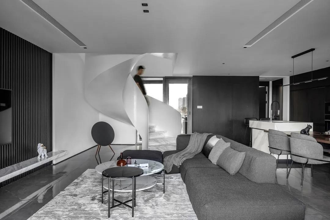 在这套200平米的复式房子中,整体采取无主灯+吊平顶天花的简约空间设计,布置现代舒适的软装家具,黑色与灰色充斥的空间下,营造出一种优雅端庄的大气与舒适氛围。