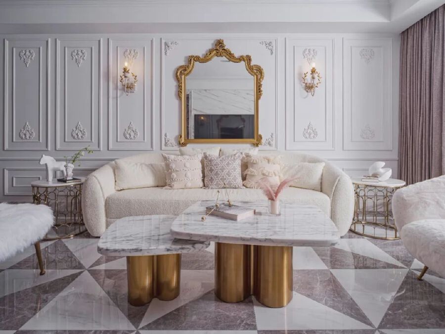 金属和石材的配合略显奢华,搭配艺术感吊顶和透明的餐椅。