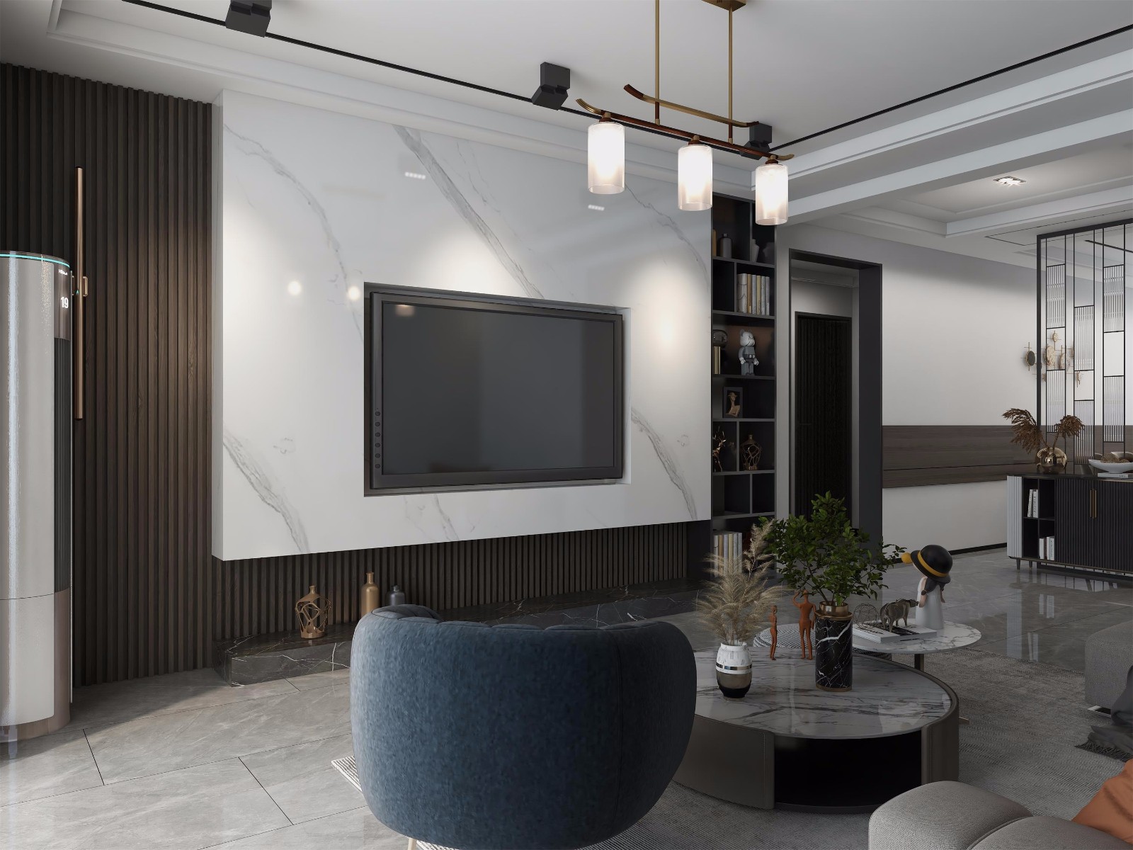 电视墙采用经典鱼肚白大理石搭配现代格栅