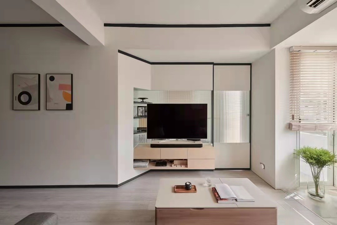 电视墙是个镂空的设计,凹进去的造型,同时还做了一扇隐形门,与后方的书房打通,让整个空间显得更加宽敞。