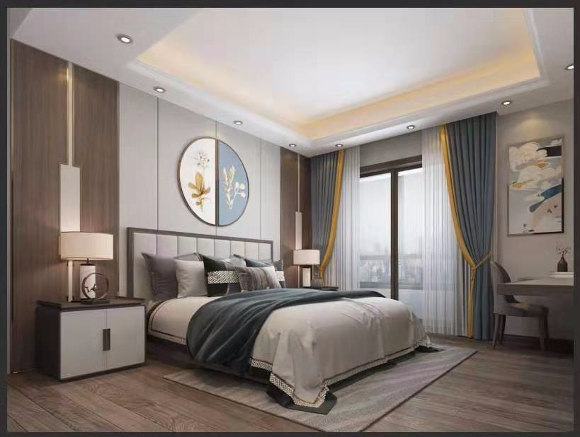 主卧背景墙由硬包+饰面板做成,再加以中式元素的金属条做点亮,给人以素净、温馨的感觉