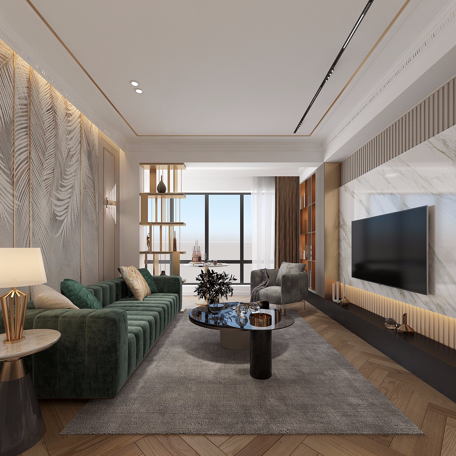 客厅采用岩板电视背景墙及木饰板,外加金属线条衬托,在视觉上色彩更加丰富