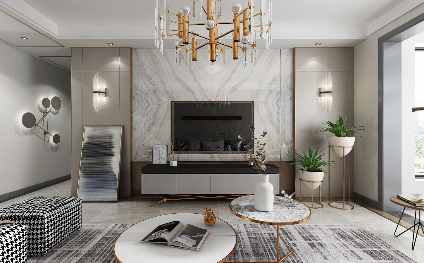 沙发背景墙中间采用白色理石两边硬包的造型,跟沙发背景前后呼应